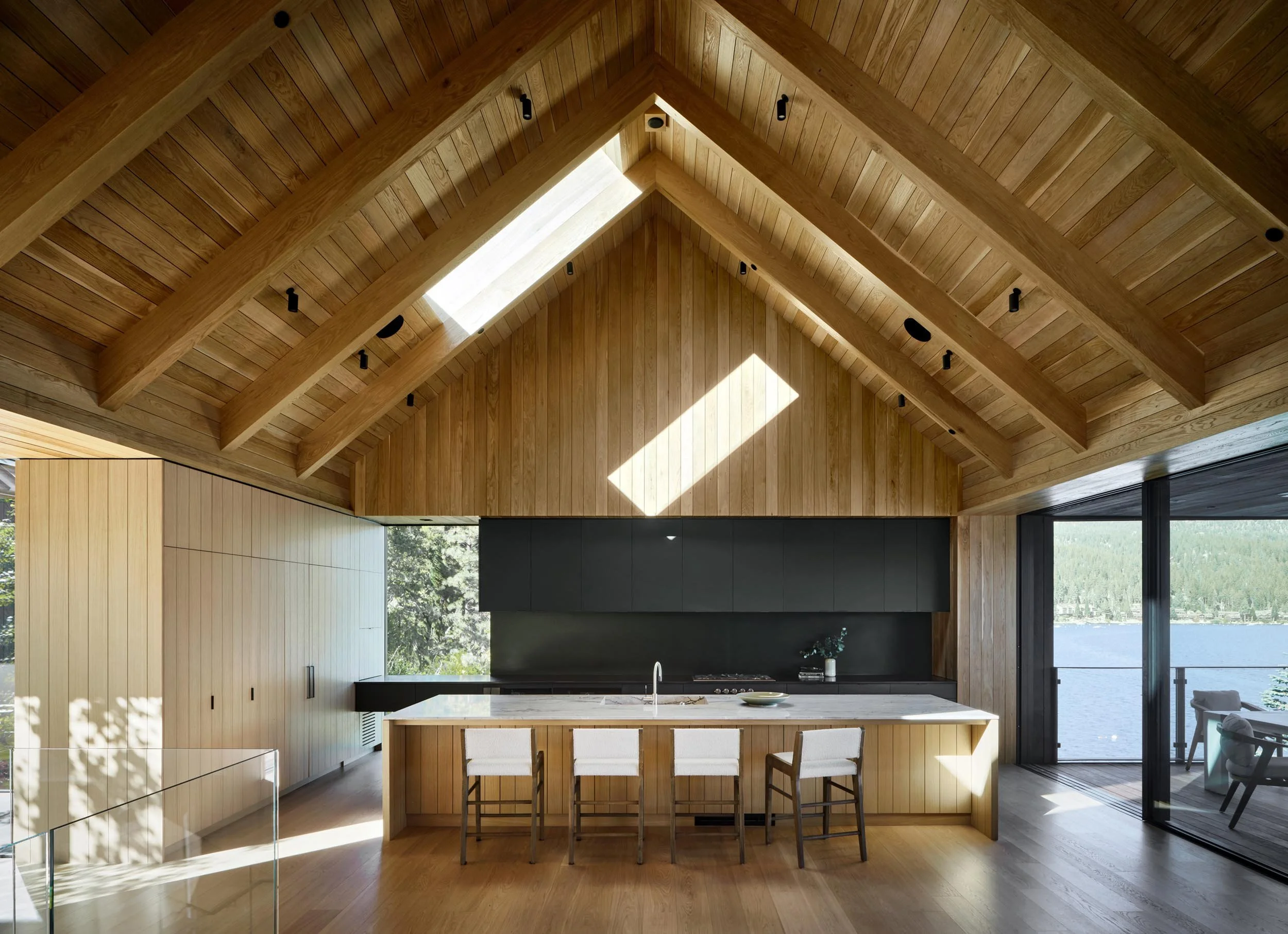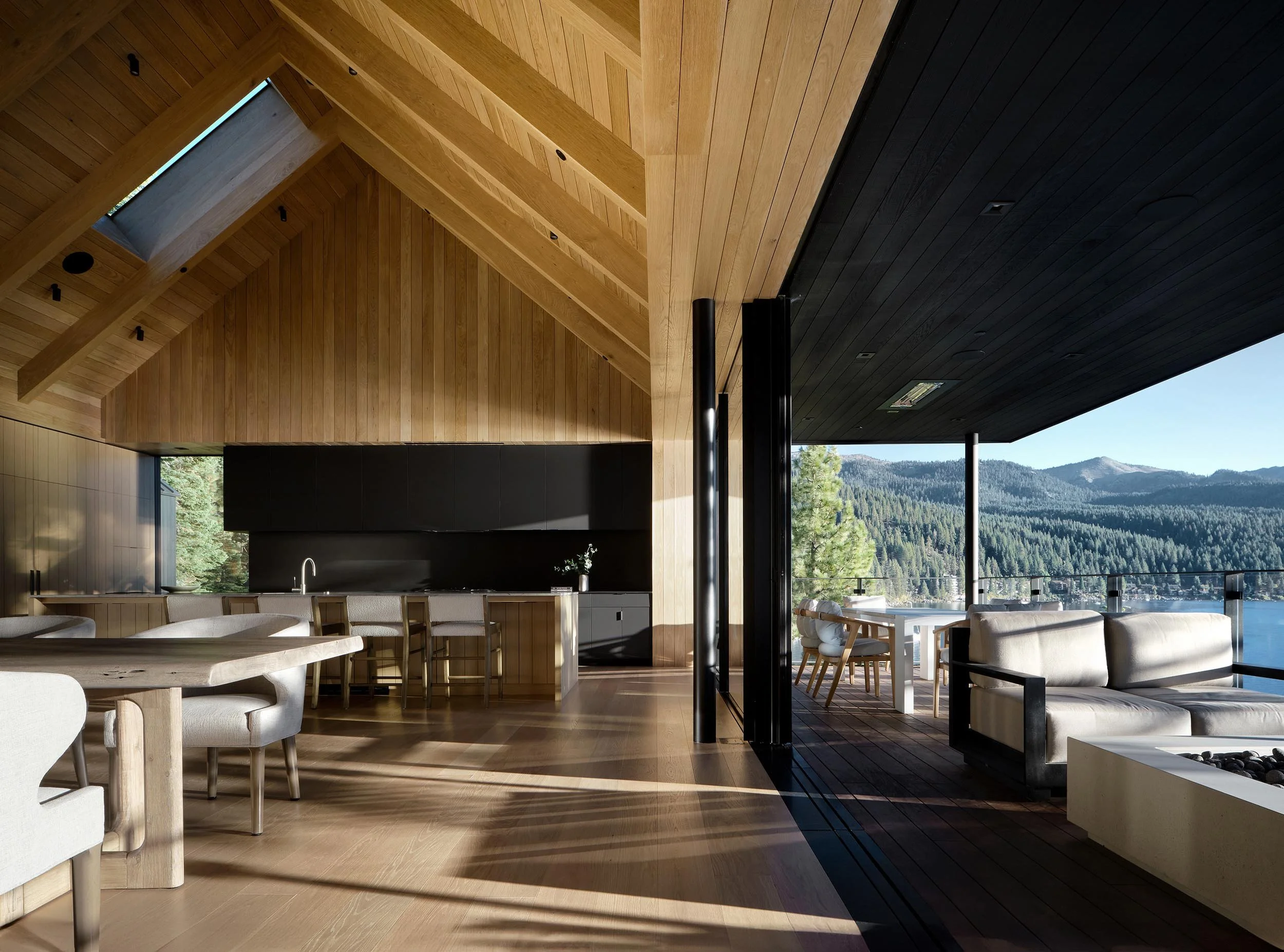 Incline Village’s three cabins dot a mountainside above Crystal Bay, an inlet of Lake Tahoe. For the client, the dark-stained buildings bring back fond memories of the lakeside cabin where he spent his childhood summers. For Ro | Rockett Design principals Jason Ro, AIA, and Zac Rockett, AIA, the project was an opportunity to create a one-of-a-kind spatial experience that brings the site’s geological features into focus.